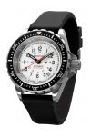 The white dial shows both 12-hour and military style 24-hour time with a date window at the 4:30 position. The dial is protected with a scratch resistant flat sapphire glass crystal with an anti reflective coating to ensure that the dial can be easily read even under direct sunlight or deep underwater.