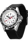 The white dial shows both 12-hour and military style 24-hour time with a date window at the 4:30 position. The dial is protected with a scratch resistant flat sapphire glass crystal with an anti reflective coating to ensure that the dial can be easily read even under direct sunlight or deep underwater.